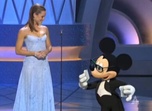 Mickey já apresentou o Oscar duas vezes. Sendo a primeira vez em 1998 e a segunda em 2003, quando ajudou a atriz Jennifer Garner a anunciar o vencedor do prêmio de Melhor Curta-Metragem de Animação.